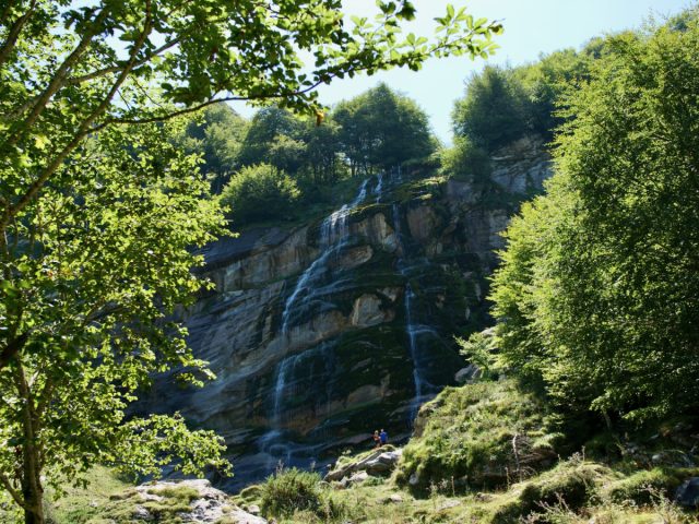 Et deux heures plus tard, nous apperçevons la cascade qui surplombe les alentours. Nichée dans un petit cirque minéral, le bruit qu'elle produit impressionne un peu plus à chaque pas