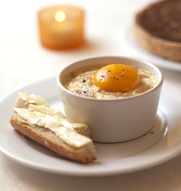 A la sortie du four, déposez un jaune d'oeuf dans chaque ramequin et servez sans attendre, avec des mouillettes au beurre demi-sel.