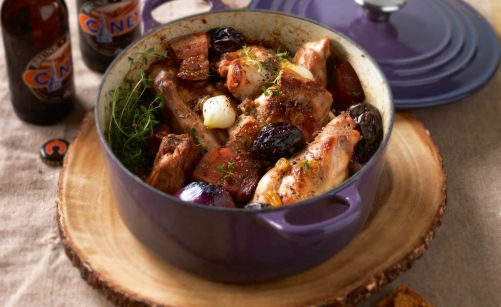 Remettre les morceaux de lapin dans la cocotte, ajoutez le laurier, les raisins secs, les pruneaux, le pain d'épices émietté, et la bière.