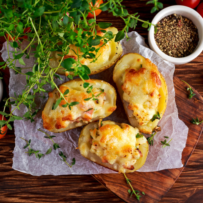 Coupez les pommes de terre en deux, creusez-les, pelez et émincez les oignons.