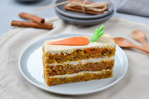 5. Une fois les gâteaux refroidis, les tartiner de glaçage à l'aide de la spatule, en les superposant les uns sur les autres. Recouvrir le dessus et les côtés de crème. Décorer le gâteau avec les carottes réalisées en pâte d'amande.